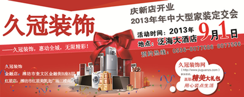 你們好!為慶新店開業(yè),回饋廣大新老業(yè)主。濰坊久冠裝飾工程有限公司本著以服務(wù)廣大業(yè)主為宗旨。將于2013年9月1日,在濰坊泛海大酒店隆重舉行2013久冠大型家裝交定會(huì)。屆時(shí),公司將推出本年度最大優(yōu)惠政策。會(huì)議期間,公司還誠(chéng)摯邀請(qǐng)了多家合作商,以便于更便捷高效的為大家服務(wù)。另外,在會(huì)議現(xiàn)場(chǎng),我們的資深設(shè)計(jì)師會(huì)為大家進(jìn)行一對(duì)一全方位貼心服務(wù)。引領(lǐng)大家走進(jìn)新的家裝世界。在此,恭候您的光臨!